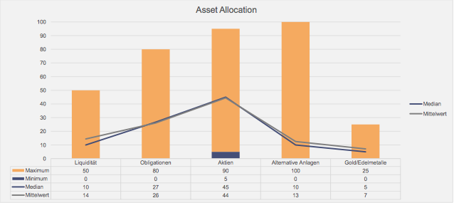 Alternative Anlagen liegen unverändert bei 10 Prozent, während der Anteil an Gold und anderen Edelmetallen 5 Prozent (unverändert) beträgt, wie der AVI-Umfrage weiter zu entnehmen ist (vgl. obige Grafik, Zahlen teilweise gerundet).
