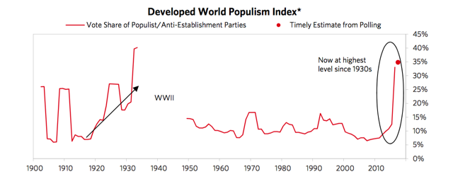 Geopolitische Risiken und ihre Auswirkungen auf die Finanzmärkte sind nicht neu. Mit Ausnahme der zwei Jahrzehnte nach dem Fall des Eisernen Vorhangs von 1989 bis zur Finanzkrise 2008 sind entsprechende Risiken eine Konstante. Neu sind aber die Qualität und Breitenwirkung populistischer Bewegungen in den Industriestaaten, wie sie etwa der Bridgewater Developed World Populism Index illustriert (vgl. nachfolgenden Chart).