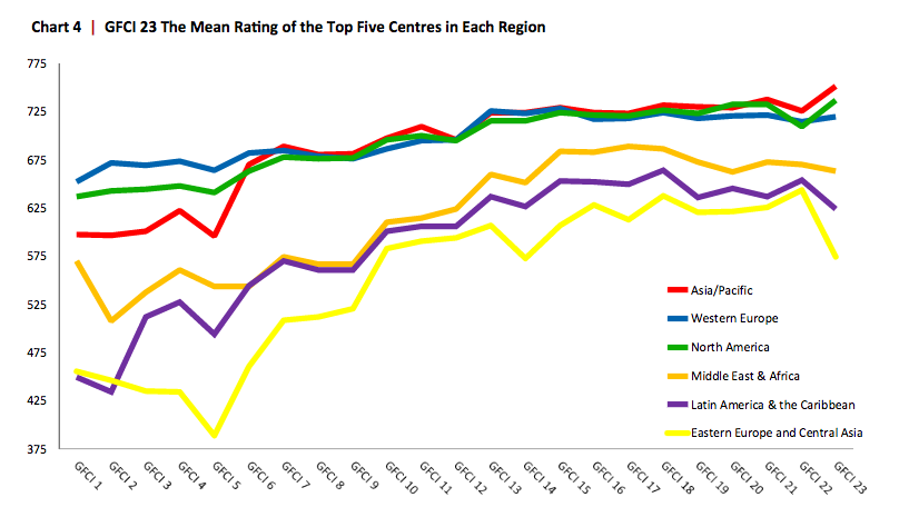 Die Entwicklung stimmt mit dem regionalen Ranking überein. Laut dem GFCI-Index haben Asien und Amerika sichtbar an Wettbewerbsfähigkeit gewonnen, während Westeuropa stagniert (siehe Grafik unten).