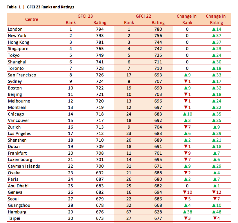 So hat Zürich gegenüber dem Stand von vor sechs Monaten sieben Plätze eingebüsst und ist auf Rang 16 gelandet. Genf hat gar zehn Ränge eingebüsst und kann nur noch einen Platz unter den ersten 30 globalen Finanzplätzen für sich beanspruchen (siehe Grafik unten). Die drei führenden Standorte sind demnach London, New York und Hongkong – zu diesem Schluss kommen die rund 2'300 Finanzprofis, welche der Thinktank heuer befragt hat.