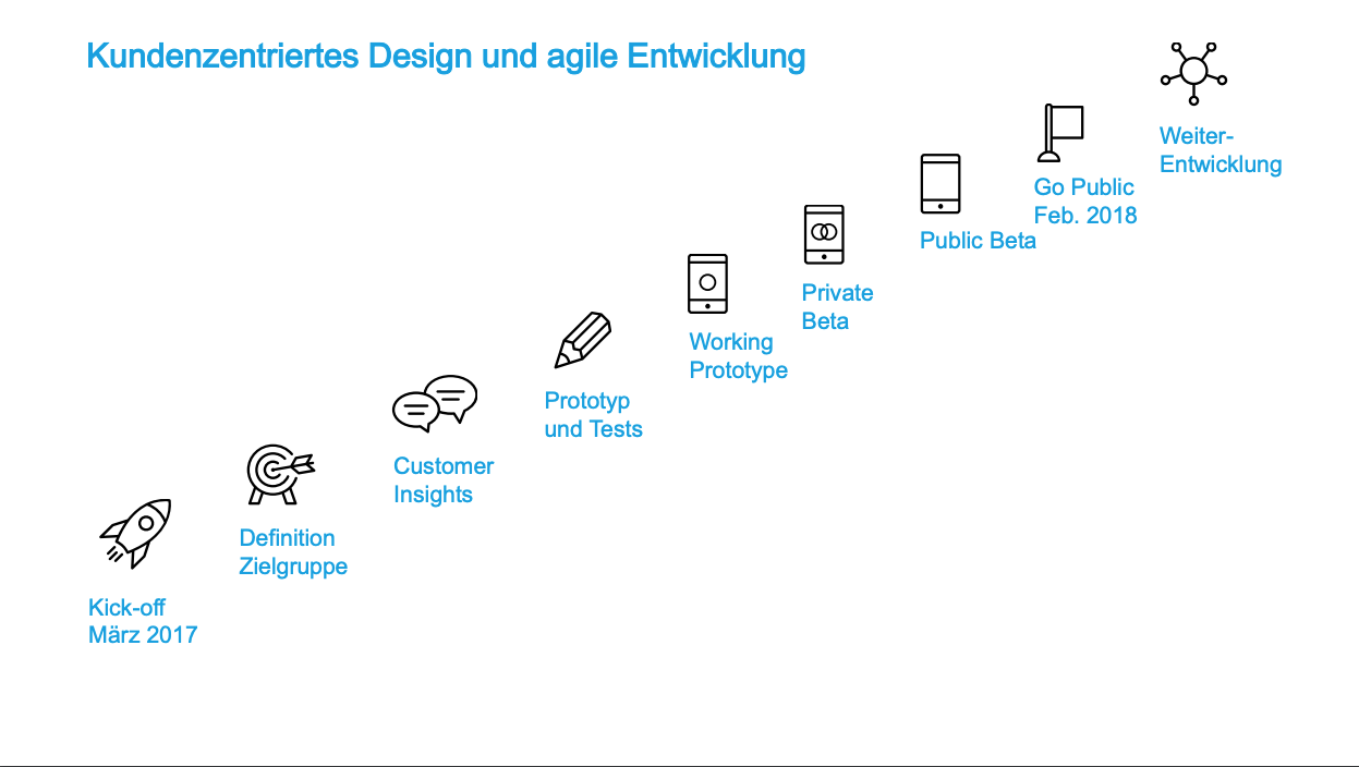 Die Bank Cler hat es in nur elf Monaten geschafft, vom Kick-off des Projekts Zak im März 2017 eine fertige Version der mobilen Bank zu bauen, die dann im Februar 2018 an den Start ging. Ein grosser Teil der Zeit, insgesamt zehn Monate, brauchte man – wie es im kundenzentrierten Design Thinking nun mal üblich ist – für den Prototypenbau und für Tests.