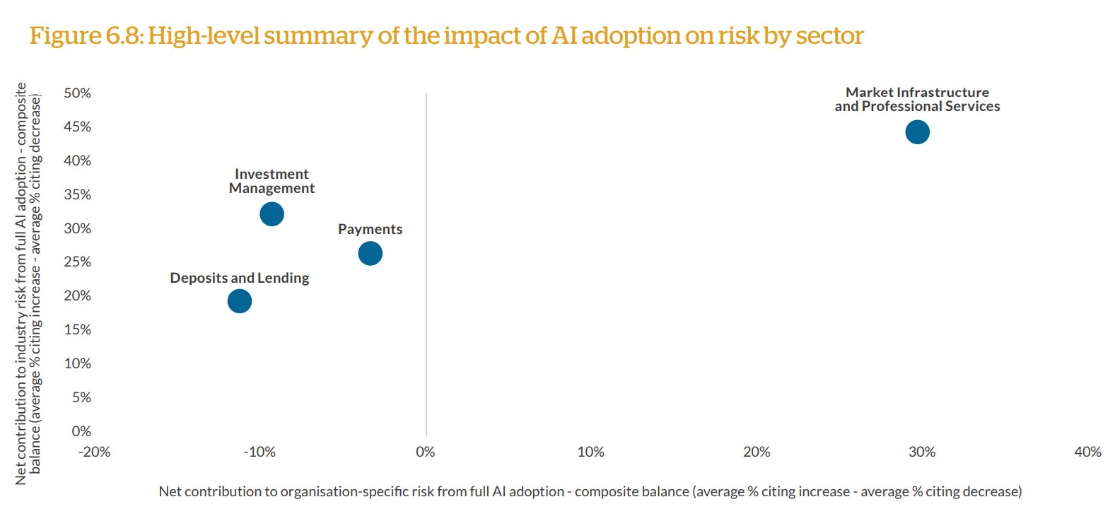 Der Beitrag von KI zur Risikoreduktion in den einzelnen Bankinstituten darf aber nicht für den Gesamtsektor generalisiert werden. Die Befragten erwarten, dass die Einführung von KI in ganz unterschiedlichen Bereichen zu einer Zunahme von Risiken führt. So bei Themen wie Cybersicherheit, Abhängigkeit von grossen Technologieanbietern oder datenbezogene Risiken wie Kundendiskriminierung oder Verletzung der Privatsphäre.