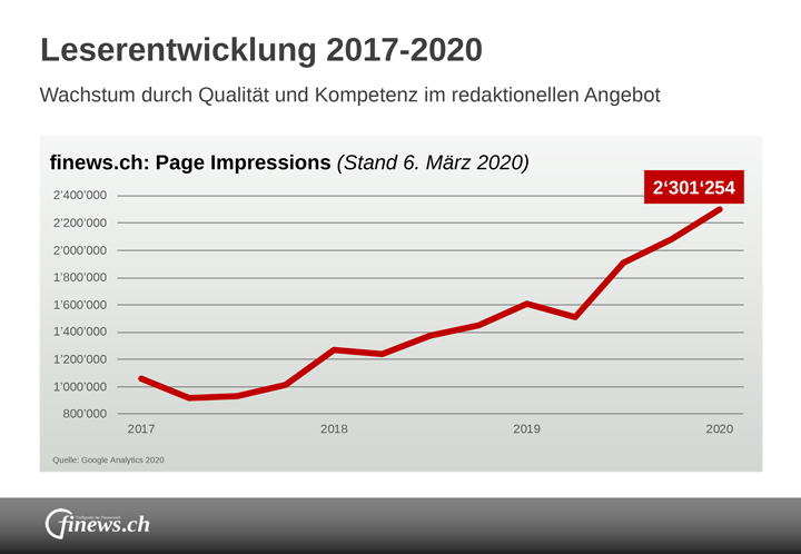 Diese mehr als 500'000 Leserinnen und Leser finden grossen Gefallen an den gebotenen News. In den meisten Fällen klicken sie auf mehrere Artikel. Das führt dazu, dass finews.ch in den vergangenen Jahren auch seine Page Impressions signifikant auf nunmehr 2,3 Millionen Seitenzugriffe pro Monat steigern konnte. Das vielfältige, laufend aktualisierte Angebot an zuverlässigen Artikeln, Analysen, Hintergründen und Interviews entspricht dem Bedürfnis einer breiten Leserschaft und liefert Orientierung in einer Welt der zunehmenden Polarisierung.