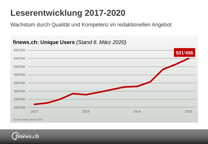 Mit der stetig wachsenden Verunsicherung durch das Coronavirus, die anhaltenden Negativzinsen und einer extrem volatilen Börsenstimmung sind verlässliche und fundierte Informationen immer wichtiger. Das Newsangebot von finews.ch entspricht offensichtlich diesem Bedürfnis: Erstmals sind es mehr als 500'000 Leserinnen und Leser (Unique User), die monatlich die Webseite regelmässig konsultieren.