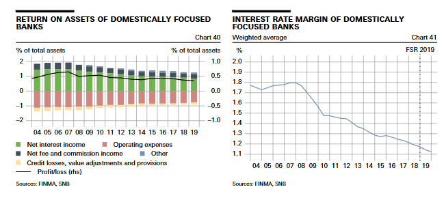Wie in einer derart tiefen Rezession nicht anders zu erwarten ist, dürfte sich auch der Geschäftsgang der Banken negativ entwickeln und dabei auf die Profitabilität drücken. Vor dem Hintergrund der zunehmenden Wettbewerbsintensität und des Rückgangs des Preis- und Zinsniveaus dürften vor allem Banken mit bedeutendem Hypothekargeschäft die weiter sinkende Zinsmarge spüren (vgl. nachstehende Grafik).