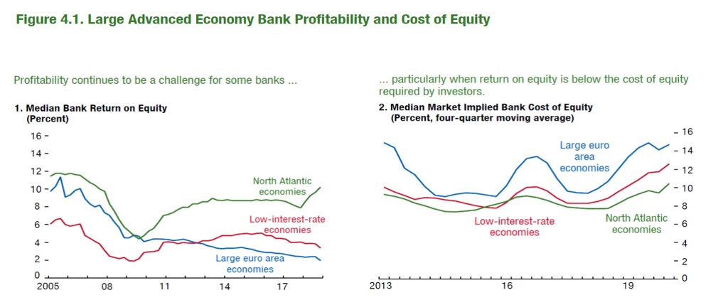 Insgesamt zeigt sich die SNB beunruhigt in Bezug auf die tiefe Profitabilität, die in einer entsprechenden Analyse auch vom Internationalen Währungsfonds (IWF) untersucht wurde. In seinem Global Financial Stability Report zeigt sich der IWF besorgt, dass die Banken in Kontinentaleuropa und Japan im Gegensatz zu Ihren angelsächsischen Mitbewerbern kaum ihre Kapitalkosten zu decken vermögen (vgl. nachstehende Grafik).