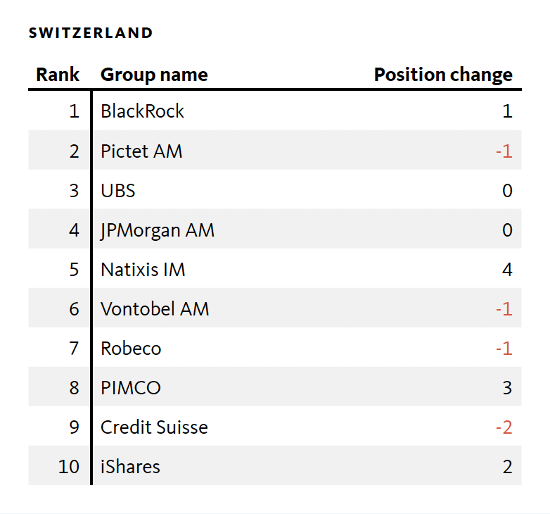 Ein Blick auf die TBS-Rangliste ausschliesslich für die Schweiz bietet einige Überraschungen: So musste in der jüngsten Erhebung Pictet Asset Management seinen Spitzenplatz an Blackrock abtreten, was vor allem auf die Grösse und die Solidität des US-Unternehmen zurückzuführen ist, wie die Autoren des Berichts schreiben, während Pictet durchaus mit Kompetenz, attraktiven Investment-Strategien und Innovation punktet, aber nicht über die riesige Präsenz und die Marketing-Ressourcen von Blackrock verfügt und daher die Spitzeposition einbüsste.