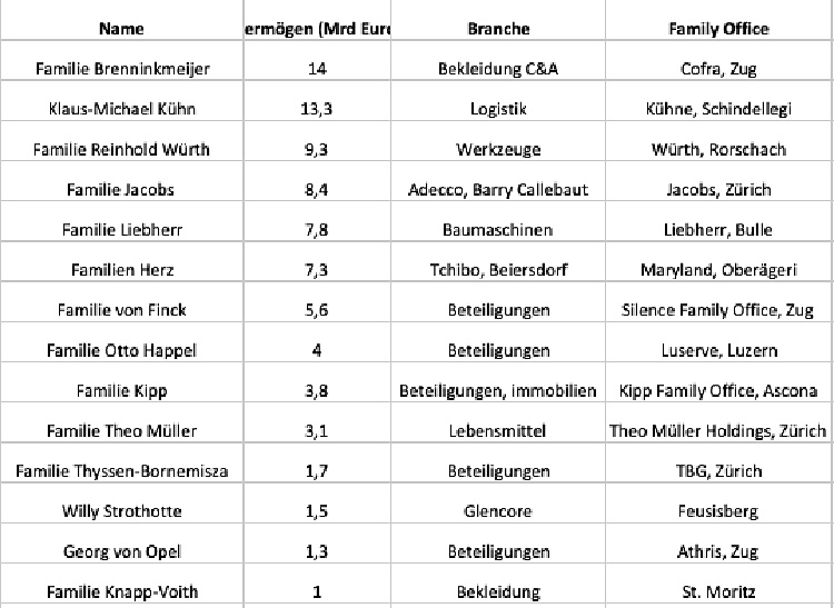 Doch die Bezeichnung «deutsche Milliardäre» muss wohl sowieso relativiert werden. Denn eine grosse Anzahl der deutschen Familien-Dynastien hat ihren Holding Sitz längst in die Schweiz verlegt. Sprich: Die Milliardenvermögen der Beisheims, Thyssens, Jacobs oder Würths werden von ihren Family Offices verwaltet – und diese liegen in der Schweiz.