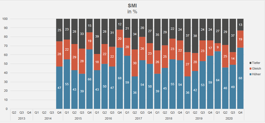 Gut zwei Drittel der befragten Akteure rechnen mit einer weltweiten Börsenhausse in den kommenden drei Monaten – insbesondere im EuroStoxx50-Index (67 Prozent der Umfrageteilnehmer) sowie im Swiss Market Index (SMI), bei dem gar 68 Prozent mit einem deutlichen Plus rechnen (vgl. nachstehende Grafik).