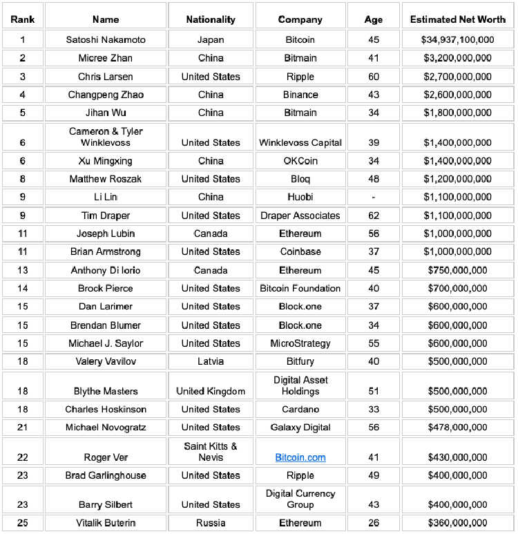 Es fällt auf: Der Reichste ist ein Phantom; bei Satoshi Nakamoto handelt es sich um den vermeintlichen Erfinder des Bitcoin. Man weiss aber bis heute nicht, wer er ist.
