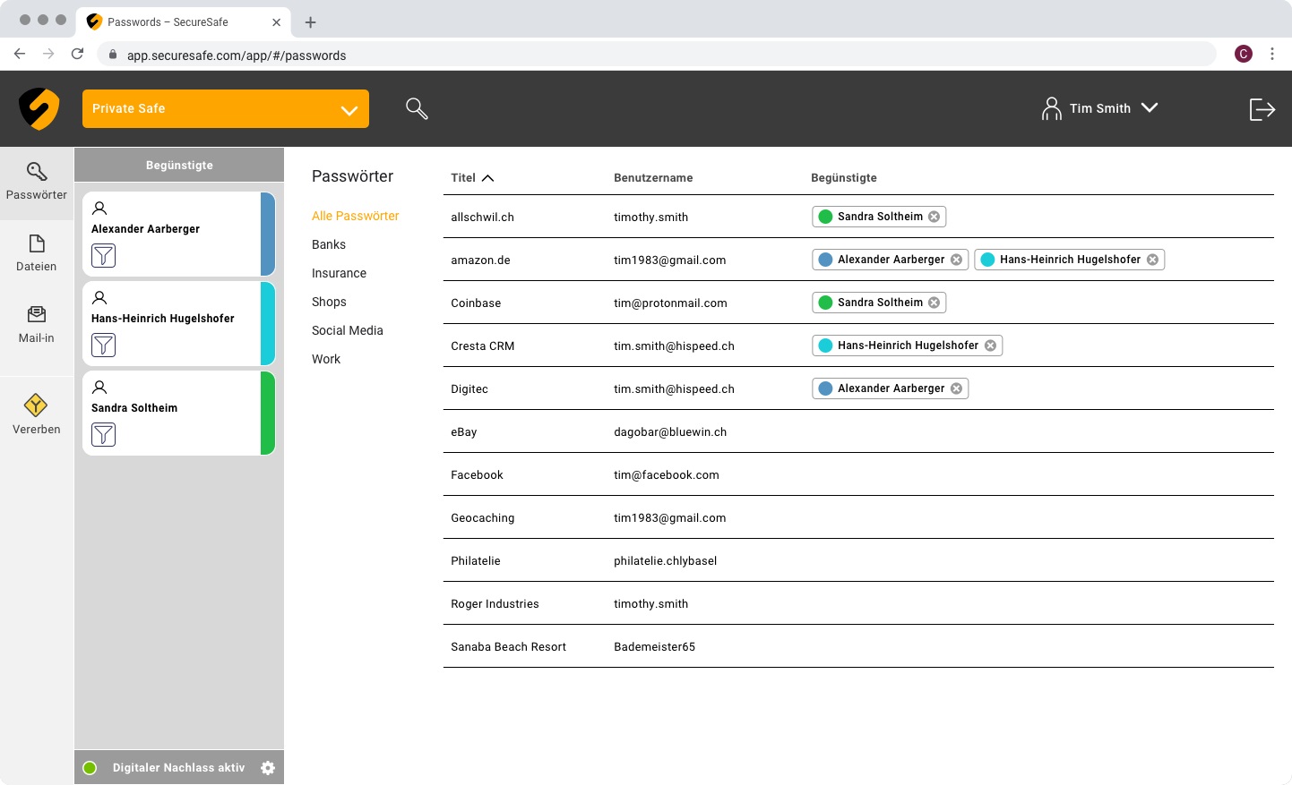 Neu ist es auch möglich, einer Person den gesamten Inhalt des Safes zu vererben. Dadurch muss man sich in Bezug auf seine persönlichen Daten nur ein einziges Mal mit diesem schwierigen Thema auseinandersetzen und hat anschliessend für sämtliche Dokumente und Passwörter vorgesorgt.