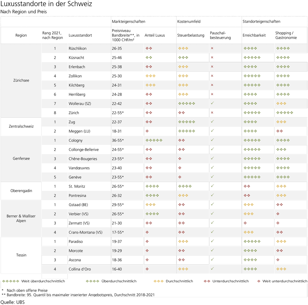 Ab 25'000 Franken pro Quadratmeter beginne in den Zürichseegemeinden Rüschlikon, Küsnacht und Erlenbach das Luxussegment. In den steuergünstigen Gemeinden Zug und Wollerau liege die Schwelle bei rund 22'000 Franken und im Tessin bei 20'000 Franken.