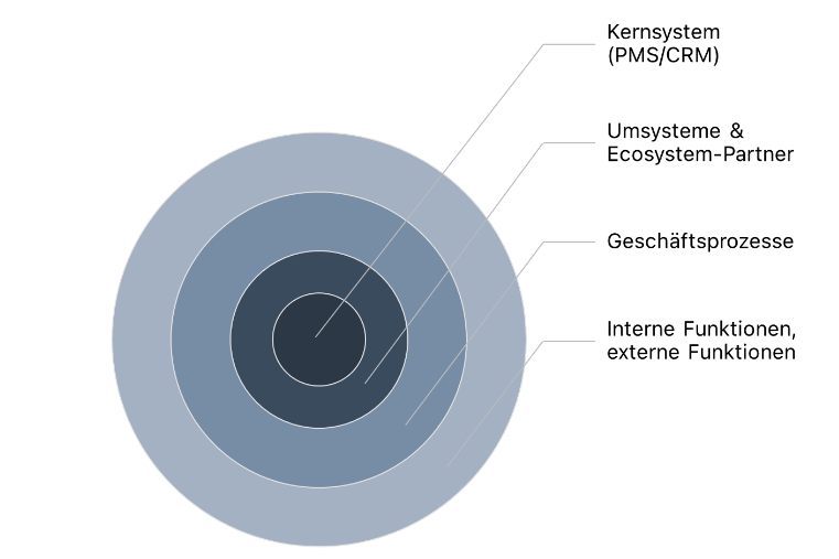 Allgemein lässt sich EAM.Technology zufolge aber festhalten, dass die Geschäftsprozesse zu einem grossen Teil von einem Kernsystem geführt und unterstützt werden. Die Umsysteme mit allfälligen «Ökosystem-Partnern» ergänzen das Kernsystem mit zusätzlichen Funktionalitäten und ermöglichen so spezifische Geschäftsprozesse und -Dienstleistungen. Interne Mitarbeitende und externe Dienstleister übernehmen schliesslich die entsprechenden Funktionen zur Ausführung dieser Geschäftsprozesse (siehe Grafik unten).