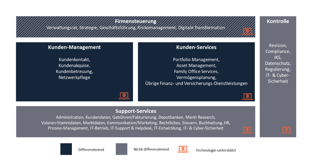 «Für Tätigkeiten und Funktionen, die nicht als Kernkompetenz oder differenzierend betrachtet werden, empfiehlt es sich zu prüfen, ob es sinnvoll ist, diese systemunterstützt, vollautomatisiert oder gar am Markt als Dienstleistung einzukaufen», ergänzt Jeannet. Natürlich sind die Prozesse von unabhängigen Vermögensverwaltern so divers wie die buntscheckige Branche selber, deren Mitglieder von der «One-man show» bis hin zu mit Banklizenzen ausgestatteten Finanz-Gruppen die verschiedensten Unternehmensformen umfassen.