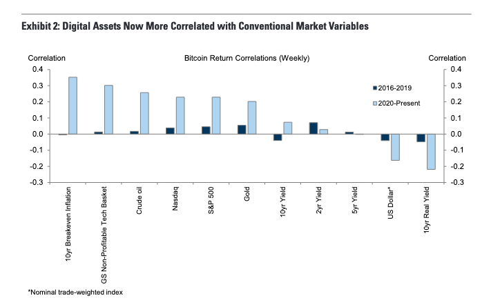 Die Goldman-Sachs-Analysten stellten in der Folge fest, dass digitale Anlagen nicht mehr als gesondertes «Ökosystem» funktionierten. Stattdessen seien sie seit Beginn der Coronakrise vor zwei Jahren immer mehr denselben Makro-Trends unterworfen, die auch traditionelle Wertschriften bewegen.