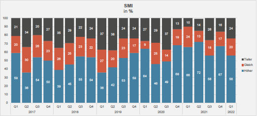 Aktuell gehen 20 Prozent (vor drei Monaten: 17 Prozent) der unabhängigen Vermögensverwaltern von stagnierenden Bewertungen aus, während 24 Prozent (vor drei Monaten: 18 Prozent) der Spezialisten fallende Kurse erwarten, wie aus der Umfrage weiter hervorgeht. In einem ähnlichen Muster präsentieren sich auch die Erwartungen für den EuroStoxx50 sowie für den S&P500. Die derzeitige Konstellation mit weltweit vergleichbaren Erwartungen ist selten, reflektiert aber die geopolitische Situation, die grossmehrheitlich vom Krieg in der Ukraine beherrscht wird.