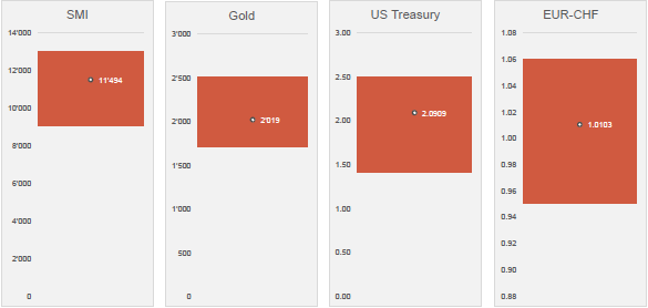 In drei Monaten (vgl. obige Grafik) sehen die unabhängigen Vermögensverwalter den Swiss Market Index (SMI) auf einem Stand von 11'494 (aktuell: 12'202); die Feinunze Gold bei 2'019 Dollar (aktuell: 1'792); die Rendite des 10-jährigen US-Treasury bei 2,09 Prozent (aktuell: 2,39) sowie den Euro-Franken-Wechselkurs bei 1.0103 (aktuell: 1.0303).
