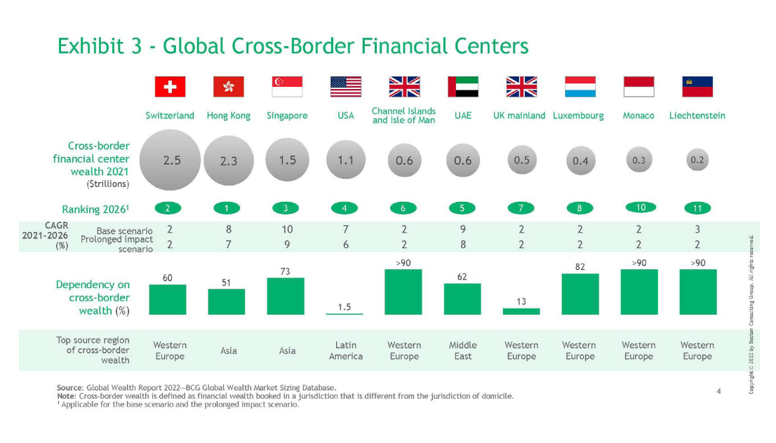 So sieht die diesjährige Ausgabe der Reichen-Studie «Global Wealth 2022» der Beratungsfirma Boston Consulting Group (BCG) die grenzüberschreitenden Vermögen bis 2026 um jährlich rund 5 Prozent wachsen; doch nicht alle Destinantion profitieren gleichermassen. Das gilt insbesondere für die Schweiz, mit 2’500 Milliarden Dollar an ausländischen Vermögen der traditionell grösste Offshore-Finanzplatz der Welt.