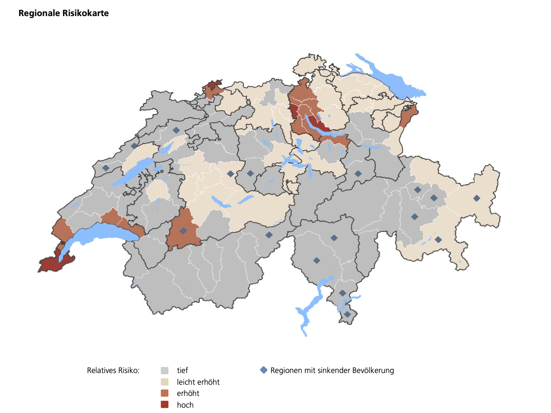Auch regional sieht die UBS die Risiken unterschiedlich. Erhöht oder Hoch seien die Bubble-Risiken insbesondere in Genf und anderen Gebieten am Genfersee, Basel, sowie rund um den Zürichsee bis hinauf nach Schaffhausen.