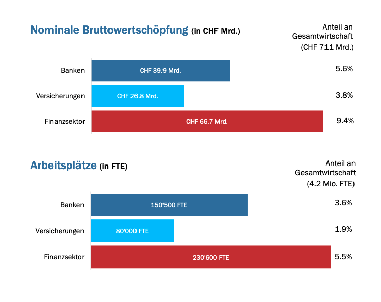 Der Schweizer Finanzsektor entwickelte sich in den vergangenen 20 Jahren dynamischer als die Gesamtwirtschaft; 2021 waren Banken, Versicherer und übrige Finanzdienstleister mit einer Brutto-Wertschöpfung von 66,7 Milliarden Franken nach dem Grosshandel und der Verwaltung die drittgrösste Branche im Land.