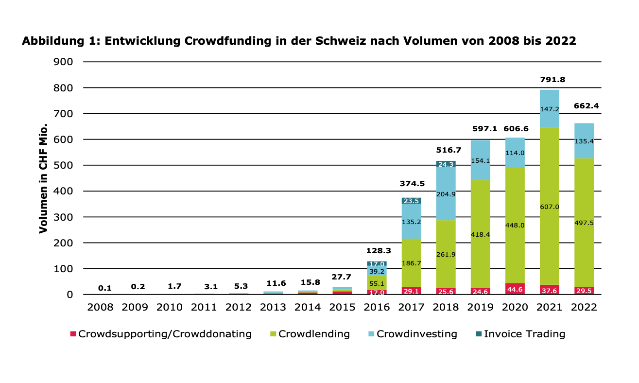 Doch im vergangenen Jahr 2022 kam der Knick. Die eingesammelten Schwarmvermögen gingen um rund 16 Prozent auf 662 Millionen Franken zurück, wie einer neuen Studie der Hochschule Luzern (HSLU) zu entnehmen ist. Der Report wurde vom Institut für Finanzdienstleistungen (IFZ) erarbeitet. Daten lieferten dabei insgesamt 27 Schweizer Crowdfunding-Plattformen.