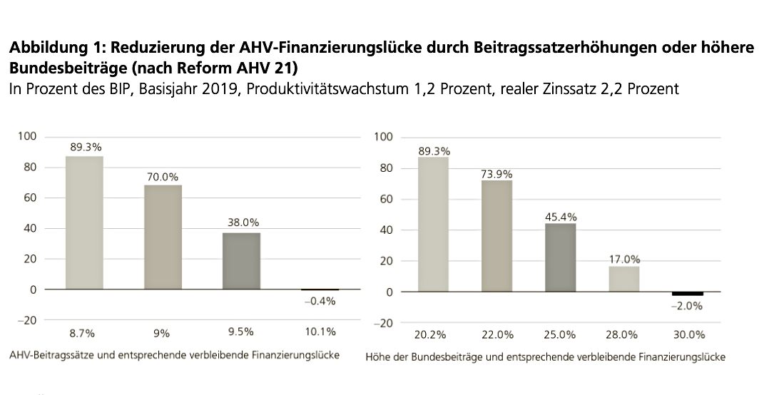 Um die Erste Säule dauerhaft zu sanieren, müssten demnach entweder die Einnahmen aus Lohnbeiträgen im Durchschnitt um jährlich 15,5 Prozent höher liegen. Oder der Bundesbeitrag, der 2019 rund 9,8 Milliarden Franken betrug, müsste um etwa 50 Prozent auf rund 14,5 Milliarden Franken erhöht werden.