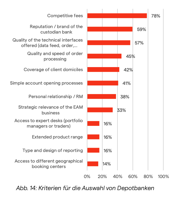 Allerdings hat die Umfrage ergeben, dass die Finanz-KMU die Zahl der Verbindungen eher verringern als erhöhen möchten und die Höhe der Gebühren nach wie vor das wichtigste Auswahlkriterium gegenüber Depotbanken ist (siehe Grafik unten). Die technologische Angebot der Institute kommt erst an dritter Stelle.