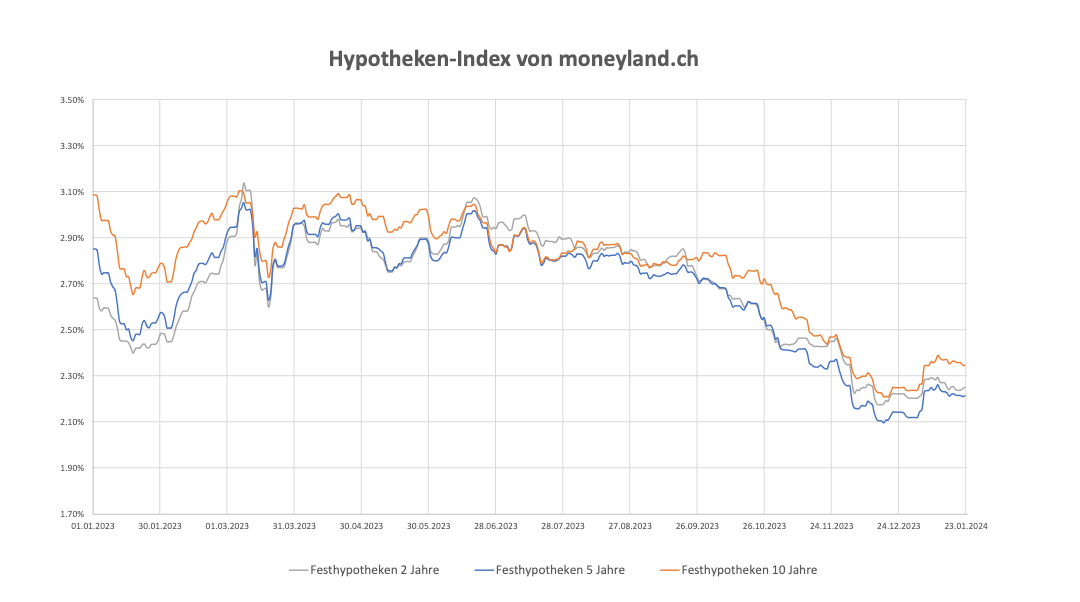 Bei den Schweizer Festhypotheken ist der markante Zinsrückgang des zweiten Halbjahres 2023 vorerst vorbei. Zum Jahresbeginn stiegen die Hypothekarzinsen gemäss dem Hypotheken-Index des Schweizer Vergleichdiensts Moneyland wieder an.