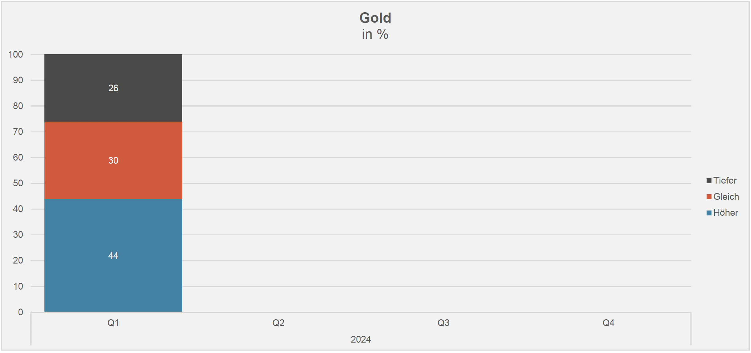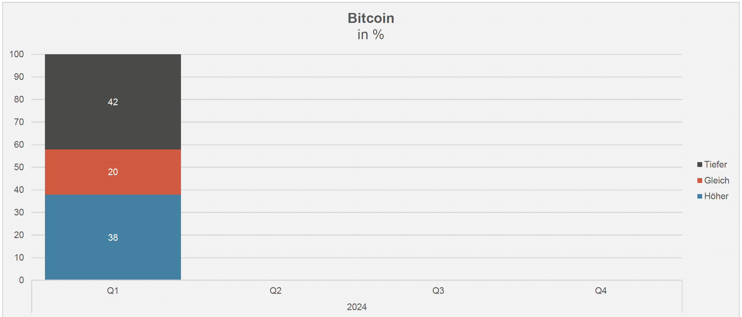 Sowohl das gelbe Edelmetall als auch Bitcoin haben im ersten Quartal 2024 neuste Höchststände markiert; 44 Prozent der Begfragten gehen beim Gold von weiteren Avancen aus; bei der Kryptowährung überwiegt die Skepsis etwas (vgl. nachstehende Grafik); «nur» 38 Prozent der Umfrageteilnehmenden sehen derzeit weiter steigende Preise, während 42 Prozent eher rückläufige Notierungen erwarten – diese Einschätzung passt indessen gut zur notorisch hohen Volatilität in dieser Anlageklasse.