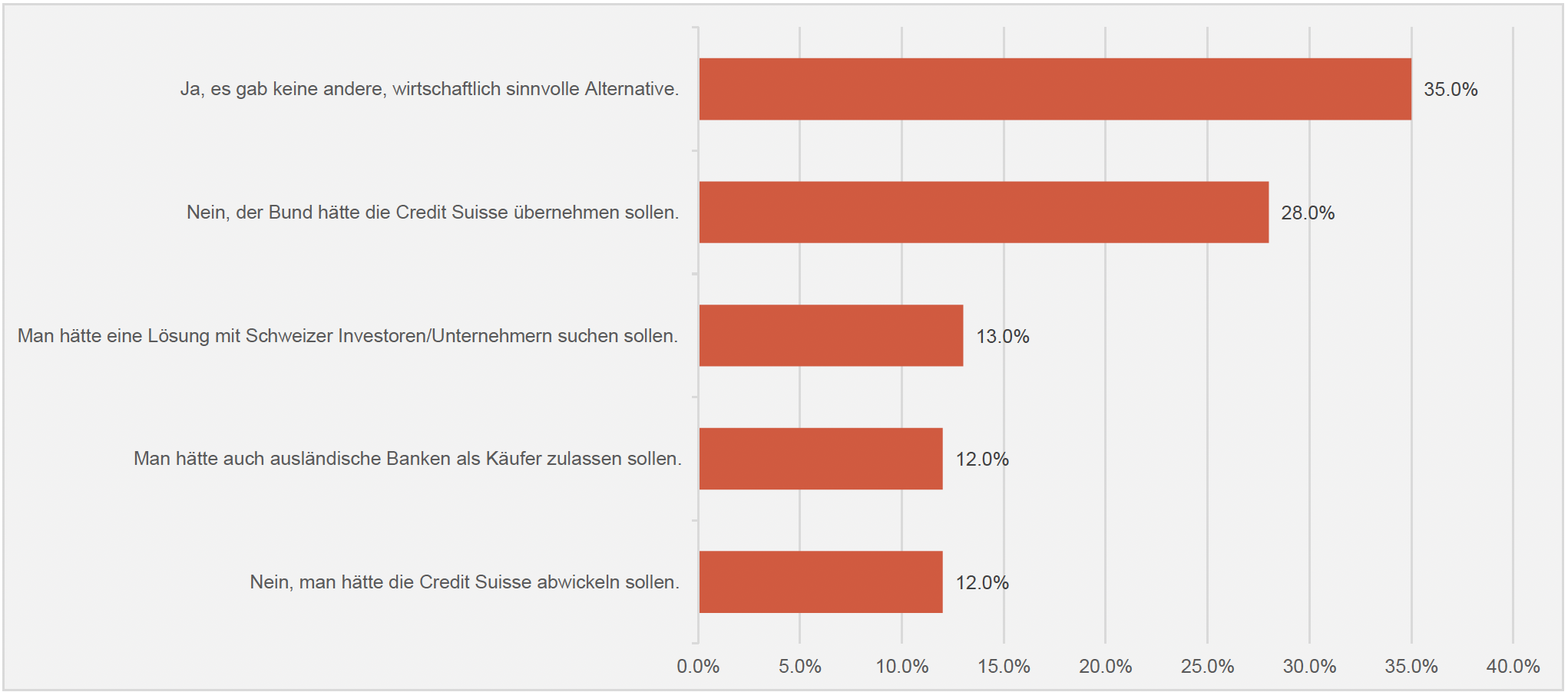 Allerdings sind auch 35 Prozent der EAMs der Ansicht, dass es zur Übernahme der CS durch die UBS keine andere, wirtschaftlich sinnvolle Alternative gegeben hätte. Damit spricht sich mehr als ein Drittel der Vermögensverwalter gegen eine Subventionierung einer maroden Bank aus (vgl. nachstehende Grafik).