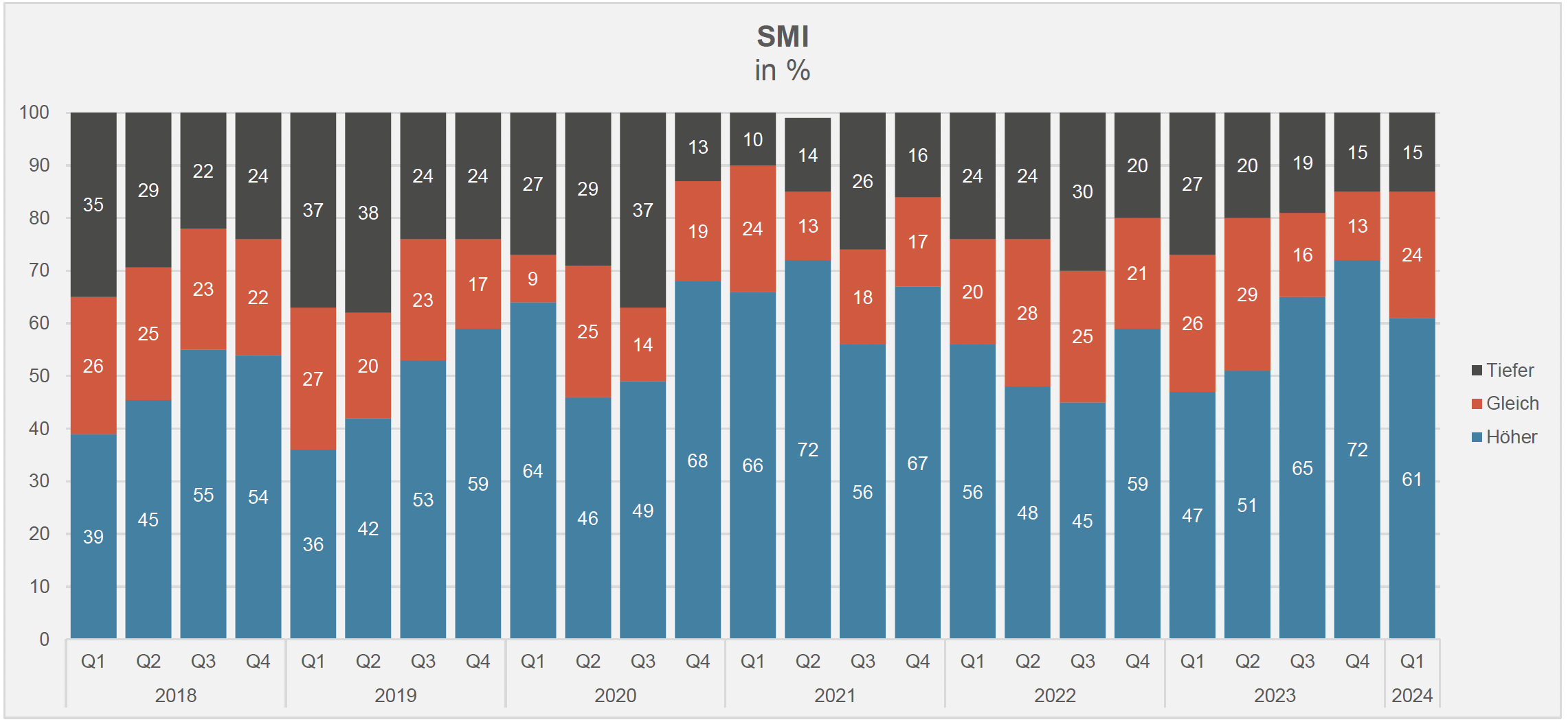 Insgesamt gehen sich die befragten EAMs von einem anhaltend guten Aktienumfeld aus, selbst wenn die Erwartung auf weiter steigende SMI-Kurse gegenüber dem Vorquartal leicht gesunken ist (vgl. nachstehende Grafik). Die Einschätzungen hängen dabei sehr stark von der Sichtweise auf die Zinsentscheide der Zentralbanken ab.