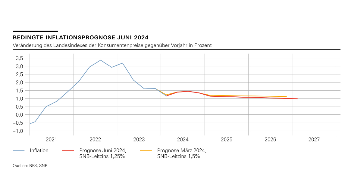 Die SNB senkt die Inflationsprognose leicht. Für das laufende Jahr wird mit einer durchschnittlichen Teuerung um 1,3 Prozent gerechnet. Für 2025 werden 1,1 Prozent und für 2026 1,0 Prozent erwartet.