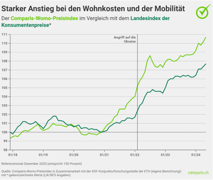 Wohnen und Mobilität sind in den Budgets der Privathaushalte grosse Positionen. Laut dem vom Vergleichsportal Comparis und der Konjunkturforschungsstelle der ETH (KOF) vierteljährlich erhobenen «Womo-Preisindex» lagen die Steigerungsraten in diesen Kategorien deutlich über den vom Bundesamt für Statistik (BFS) ausgewiesenen Zahlen des Landesindex der Konsumentenpreise.