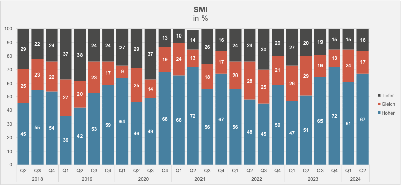 Insgesamt gehen die befragten External Asset Managers von einem anhaltend guten Aktienumfeld aus. Die Erwartung auf steigende SMI-Kurse gegenüber dem Vorquartal ist deutlich gestiegen (vgl. nachstehende Grafik). Die Einschätzungen hängen dabei sehr stark von der Sichtweise auf die Zinsentscheide der Zentralbanken ab (vgl. nachstehende Grafik).