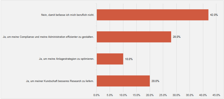 Exakt 20 Prozent wollen mit KI der Klientel besseres Research-Material liefern, und 10 Prozent der unabhängigen Vermögensverwalter optimieren ihre Anlagestrategie mit KI-Modellen.