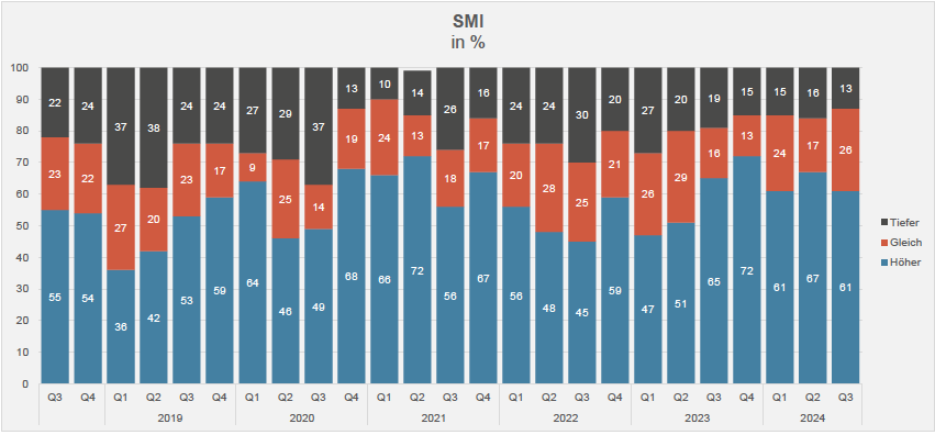 Mit Blick auf die Börsenentwicklung in den nächsten zwölf Monaten sind die unabhängigen Vermögensverwalter beim Swiss Market Index (SMI) etwas verhaltener in ihrer Einschätzung geworden. Bloss 61 Prozent (nach 67 Prozent vor drei Monaten) gehen noch von weiter steigenden Kursen aus.