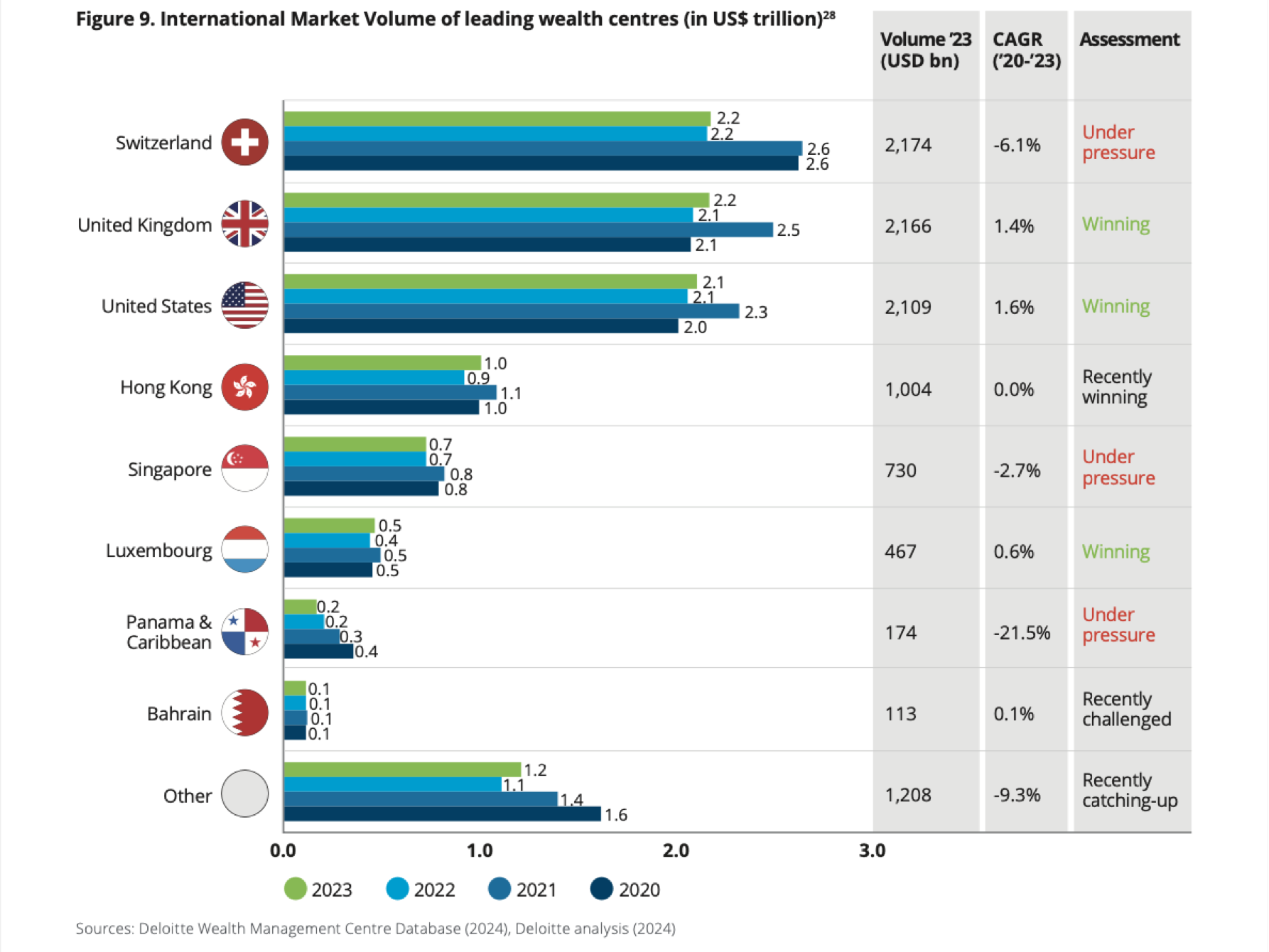 Deloitte hat zum fünften Mal die weltweit führenden Vermögensverwaltungszentren analysiert und eingestuft. Grundlage sind die Wettbewerbsfähigkeit und die Grösse; der Fokus lag ausschliesslich auf dem Bereich Offshore. Letztmals wurde die Studie 2021 erstellt.