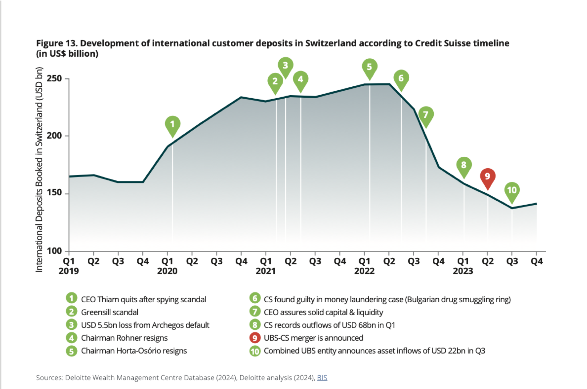 Über die Auswirkungen des Niedergangs der Credit Suisse (CS) auf den Finanzplatz wird weidlich gestritten. Deloitte kommt in seiner Studie zum Schluss, dass die Stabilität des Wirtschafts- und Bankenmarkt der Schweiz stark darunter gelitten haben. Alleine bei den Cash Deposits betrug der Abfluss rund 100 Milliarden Dollar. Von diesem Schock hat sich der Finanzplatz noch nicht erholt.