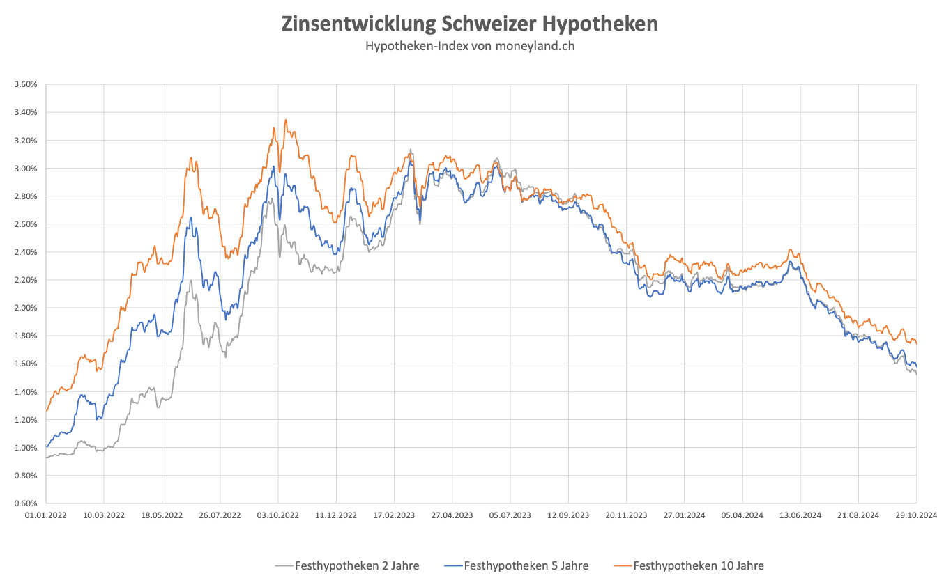 Der aktuelle von Moneyland.ch berechnete Durchschnittszinssatz für zehnjährige Festhypotheken liegt Ende Oktober bei 1,74 Prozent. Seit Mitte Jahr habe die Entwicklung kontinuierlich nach unten gezeigt und die Zinsen seien damit so tief wie seit Frühjahr 2022 nicht mehr, wie das Vergleichsportal am Mittwoch schreibt.