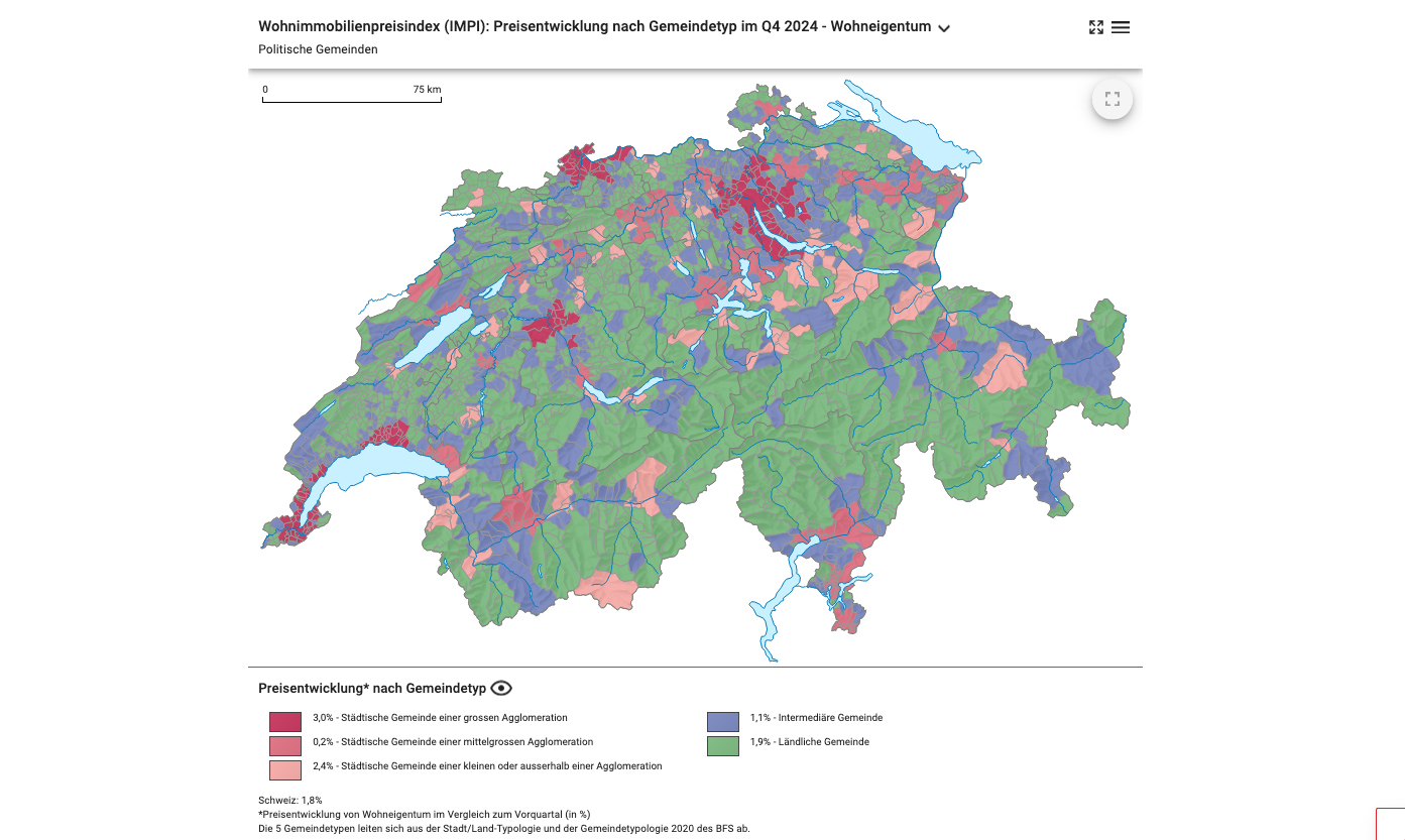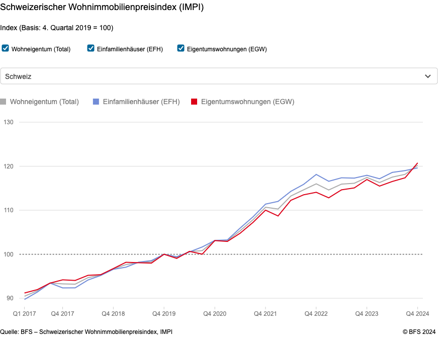 Die vom BFS errechnete durchschnittliche Jahresteuerung für Wohneigentum beträgt damit 1,7 Prozent, wobei die Preise für Eigentumswohnungen 2024 mit durchschnittlich plus 2,3 Prozent deutlich stärker gestiegen sind als die für Einfamilienhäuser mit durchschnittlich 1,1 Prozent.