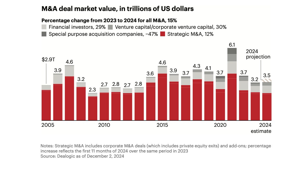 In den vergangenen drei Jahre habe sich das Geschäft eher zurückhaltend entwickelt, schreibt das Unternehmen weiter. Nach dem kurzen Post-Covid-Boom 2021 sanken die Transaktionsvolumen wieder spürbar. Im Jahr 2024 projiziert die Studie einen Anstieg der Volumen um 15 Prozent auf rund 3,5 Billionen Dollar.