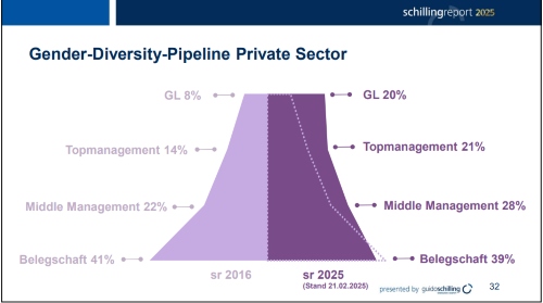 Ein entscheidender Faktor für die Zukunft ist die Gender-Diversity-Pipeline, also die Förderung weiblicher Talente im Management. Während der Frauenanteil im Topmanagement in den letzten zehn Jahren von 14 auf 21 Prozent stieg, wuchs er im Middle Management von 22 auf 28 Prozent. Dies deutet darauf hin, dass langfristig mehr Frauen in Führungspositionen aufrücken könnten.