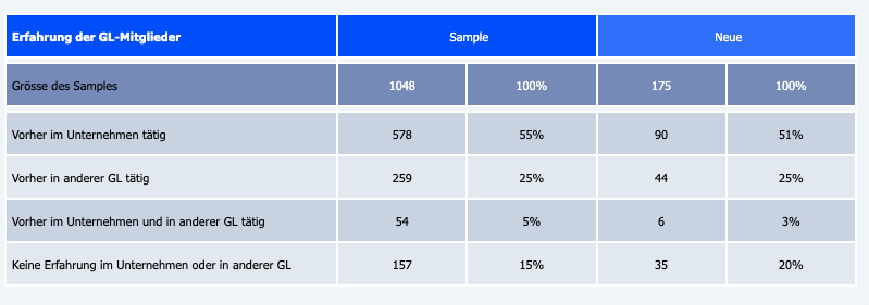 Auch in der Geschäftsleitung macht sich dieser Trend bemerkbar: Die Hälfte der neu ernannten Mitglieder war zuvor bereits im Unternehmen tätig. Im Durchschnitt dauert es zehn Jahre, bis intern beförderte Männer in die Geschäftsleitung aufsteigen (siehe Tabelle ganz unten). Frauen schaffen es im Schnitt nach acht Jahren.