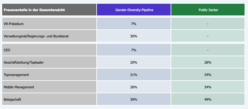 Zwischen den Branchen wird ein klarer Unterschied ersichtlich: Versicherungen schneiden beim Thema Diversität deutlich besser ab als Banken – sowohl auf Stufe Geschäftsleitung als auch in der Gesamtbelegschaft. Im Bericht werden die Werte auch mit denjenigen des öffentlichen Sektors verglichen (siehe Tabelle oben).