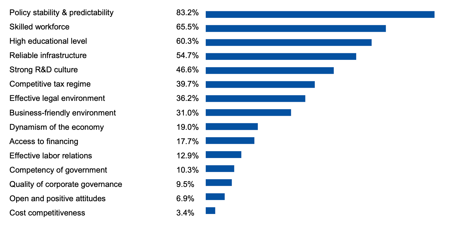 Aufschlussreich sind auch die Umfrageergebnisse bei den Führungskräften. Neben dem politischen Umfeld und der guten Infrastruktur werden hier die qualifizierten Arbeitskräfte und der hohe Ausbildungsstandard genannt, eine stark R&D-Kultur und das wettbewerbsfähige Steuersystem. Tiefe Ergebnisse liefert die Befragung bei den Punken Kosten, der Frage nach einer «offenen und positiven Einstellung» oder der Qualität in der Unternehmensführung.