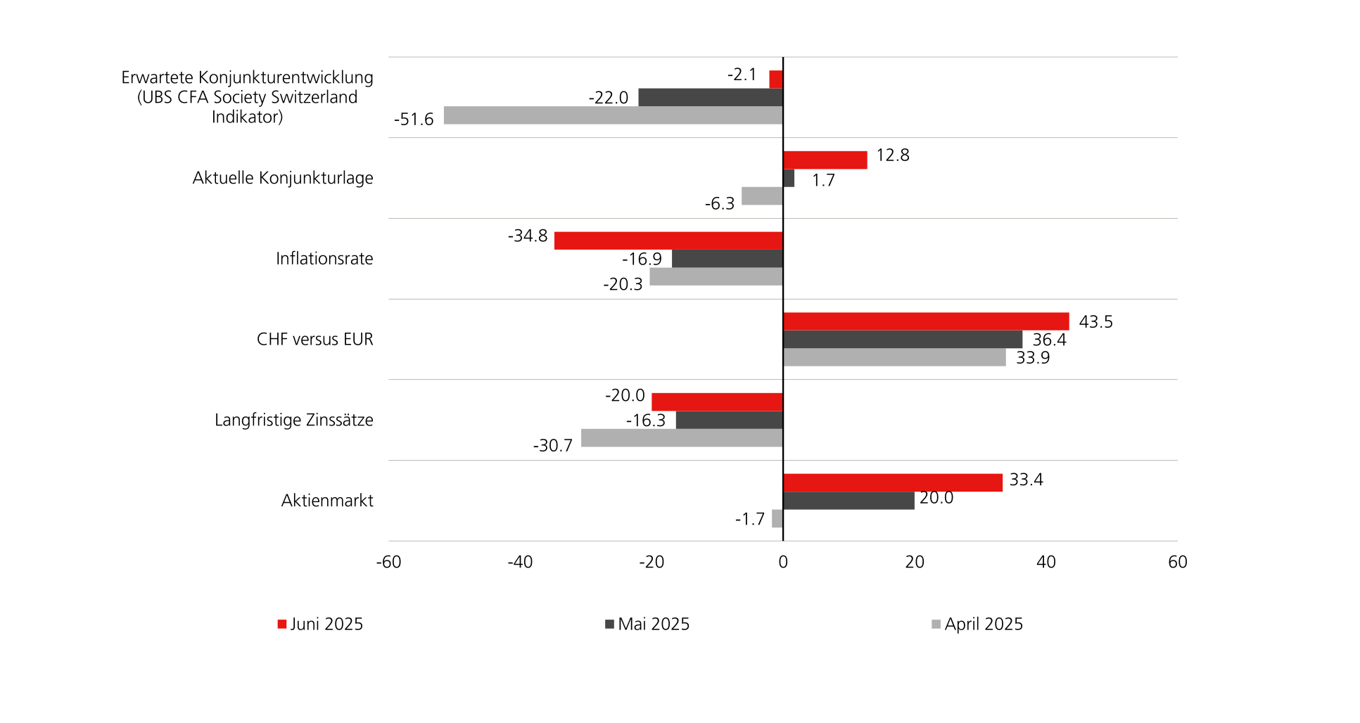 Nach dem starken Stimmungseinbruch im April habe im Mai bereits wieder eine Erholung eingesetzt, schreibt die UBS am Mittwoch in ihrem «CFA Society Switzerland Indikator». Dieser Trend habe sich auch im Juni fortgesetzt.