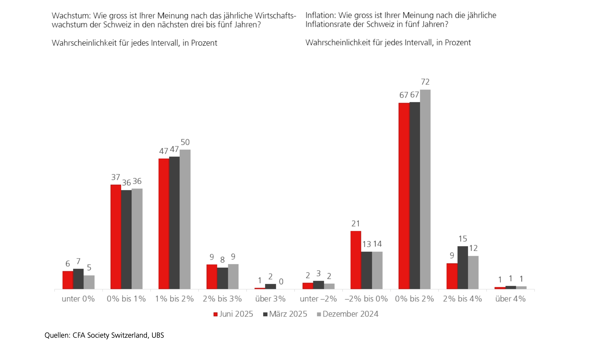 Für die Schweiz zeige sich der langfristige Wachstums- und Inflationsausblick stabil. Trotz der geo- und handelspolitischen Verwerfungen seien die Prognosen in den vergangenen Monaten weitgehend unverändert geblieben. Die Finanzanalysten veranschlagen die Wahrscheinlichkeit für ein Wirtschaftswachstum für die Schweiz von 1 bis 2 Prozent in den nächsten drei bis fünf Jahren mit rund 50 Prozent. Zu den Ergebnissen vom März und dem vergangenen Dezember sei dieser Wert stabil.