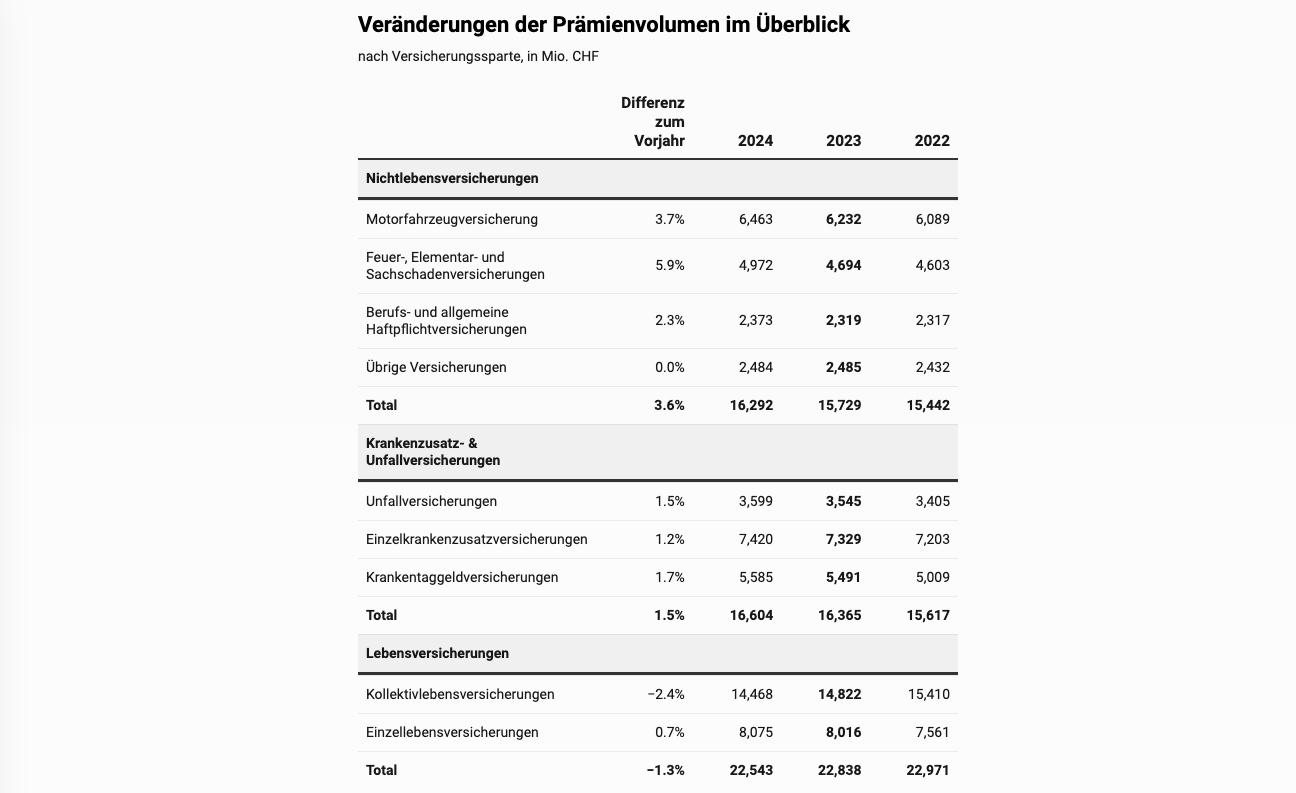 Im vergangenen Jahr haben sich eine Reihe von Trends in der Schweizer Versicherungswirtschaft fortgesetzt. Motorfahrzeugversicherungen und andere Schadenversicherungen wurden teurer. Der Abwärtstrend im Bereich Leben setzte sich fort.
