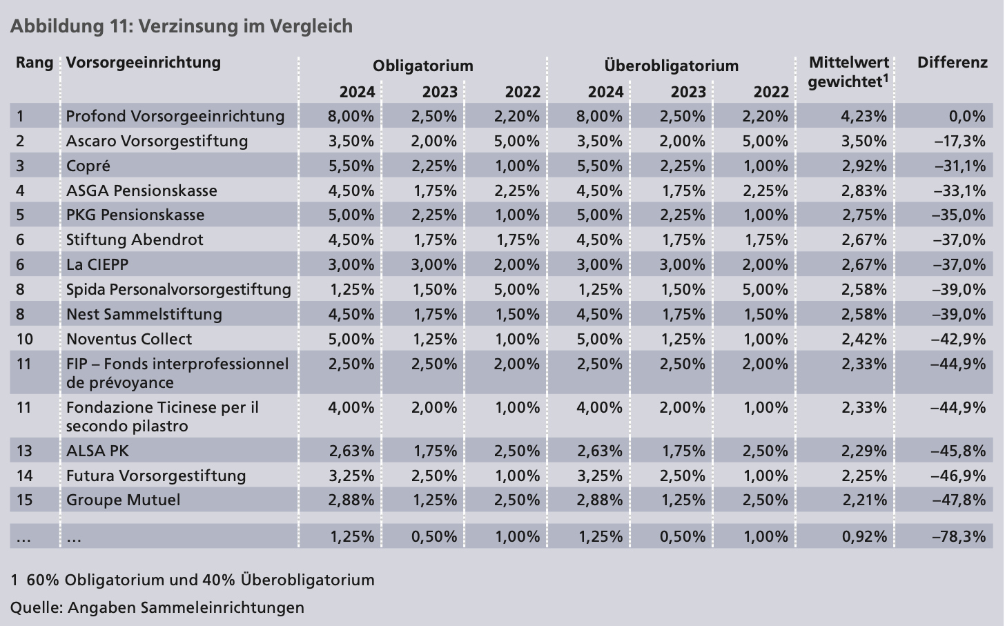 In dem Ranking wurde der Mittelwert der Verzinsungen der Jahre 2022 bis 2024 berücksichtigt. «Die Unterschiede sind bereits bei den Top 3 gross: die dritthöchste Verzinsung ist rund 31 Prozent tiefer als die höchste», schreiben die Experten. In den drei Jahren habe die Verzinsung der letztplatzierten Vorsorgeeinrichtung rund 78 Prozent tiefer gelegen als bei der bestplatzierten.