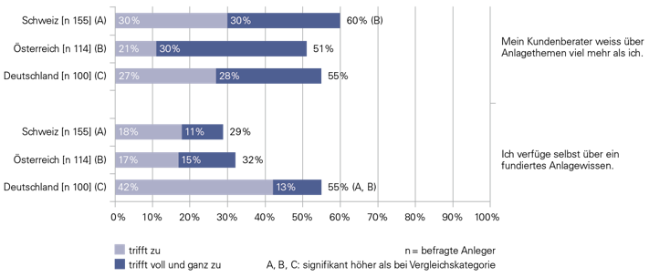 Denn mit Werten zwischen 40 und 50 Prozent ist ein durchaus bedeutender Teil der Befragten der Ansicht, dass ihr Kundenberater – der im allgemeinen Verständnis ja als Experte in Sachen Geldanlagen gilt – in diesem Bereich nicht über mehr Wissen verfügt als sie selbst. Besonders die deutschen Studienteilnehmer schätzen ihr Wissen in Anlagethemen hoch ein – signifikant höher als Schweizer und Österreicher.